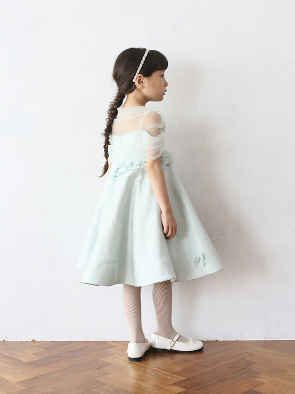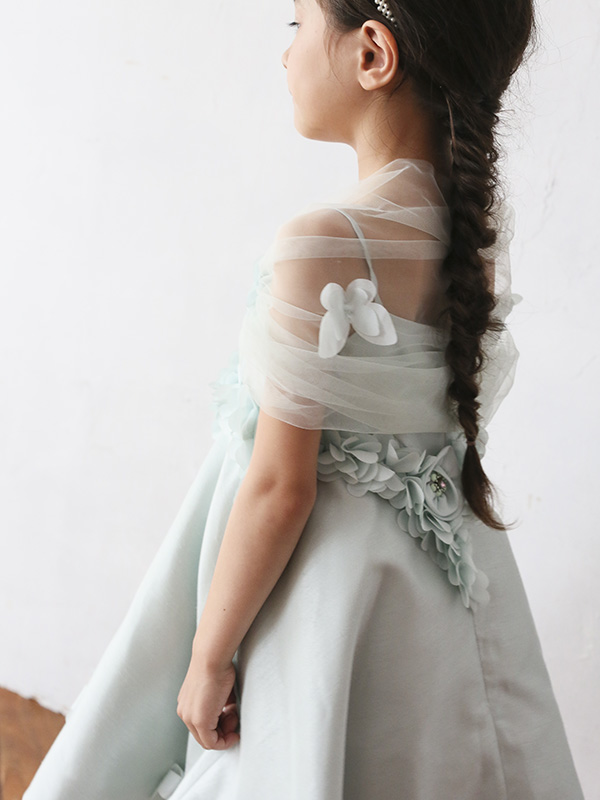 爽やかなミントグリーンのドレスには背中周りにふわっとチュールがほどこされ、ウエストラインにはお花のようなモチーフ。ところどころに蝶々がとまってるようなデザインはまるで妖精のような可愛らしいドレスです。スカート部分の裏地がしっかりしており、ハリがあるのでAラインがとてもきれいにお召し頂けます。110cm・120cmのお取り扱いございます。 モデル身長113㎝ シンフォニーミント110cm着用)