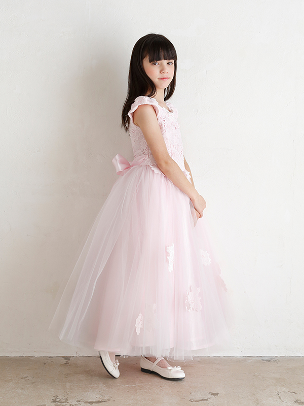 女の子の可愛さをより引き出してくれるピンク。ボリューミーなピンクのロングドレスは、胸元のフラワー刺繍がチュール部分にもほどこされとても華やか。舞台映えのするロング丈ですのでコンクールにも最適です。130cm・140cmのお取り扱いございます。