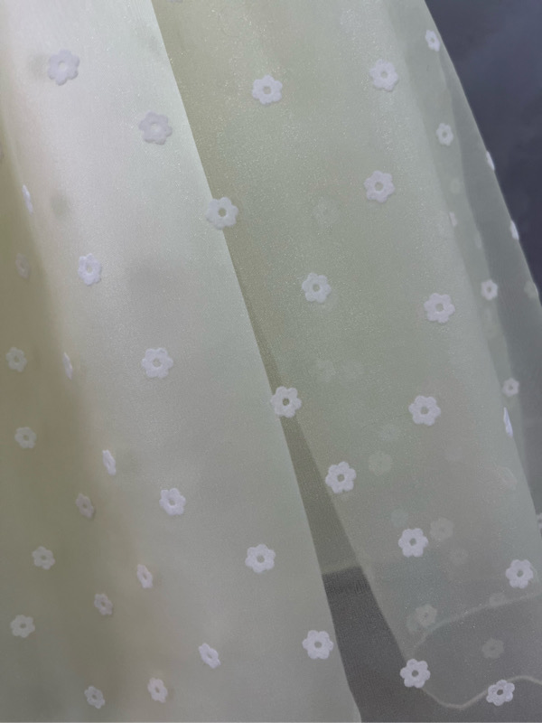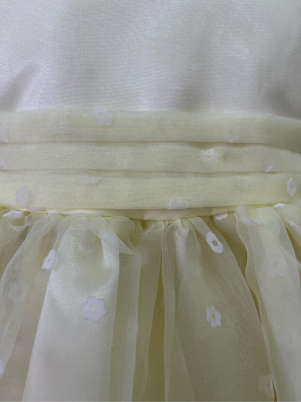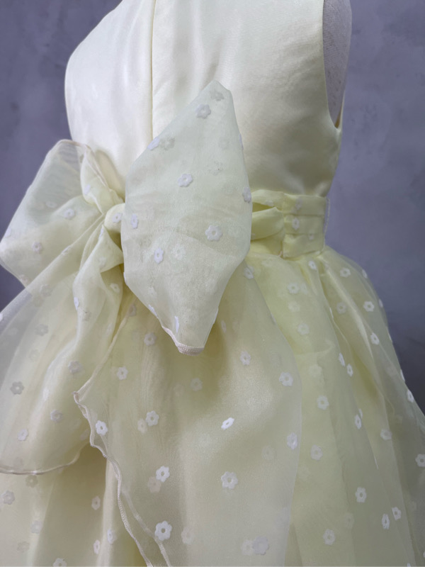 パステルイエローが華やかな印象、スカートチュールにフロッキーフラワーがあしらわれてます。ウエストのいリボンの幅が広く結ぶと大きく、バックスタイルも可愛いデザインです。幅広いシーンでご活用いただけます。結婚式参列衣装・発表会人気です。