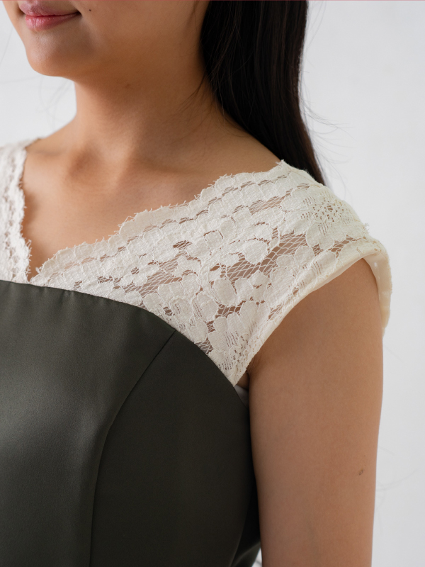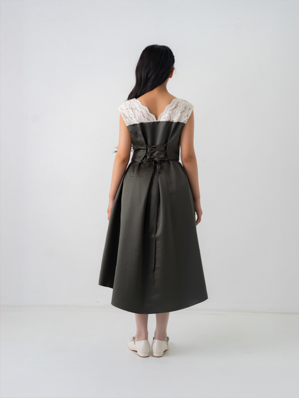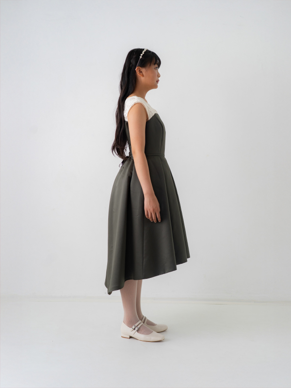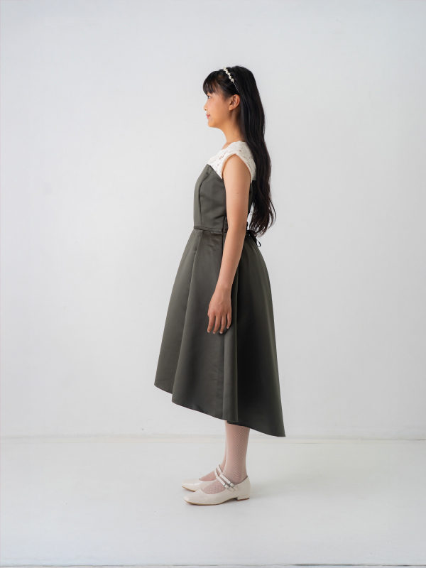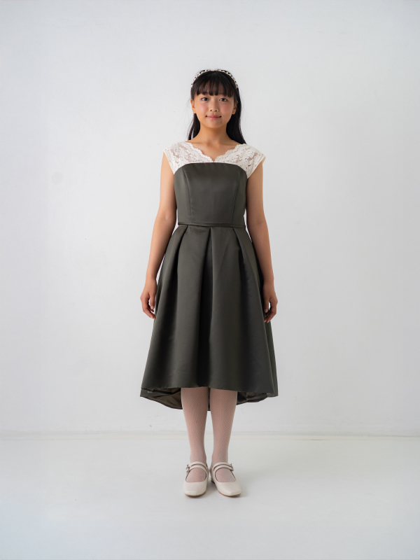 オリーブカラーが落ち着いた印象のこちらの商品は、フィッシュテールデザインが特徴となります。後ろが少し長いスカートのシルエットが素敵です。後ろでリボン調整ができます。ジュニアから大人の方までお召しいただけます。商品サイズを必ずご確認ください