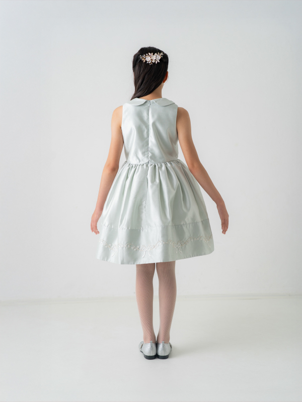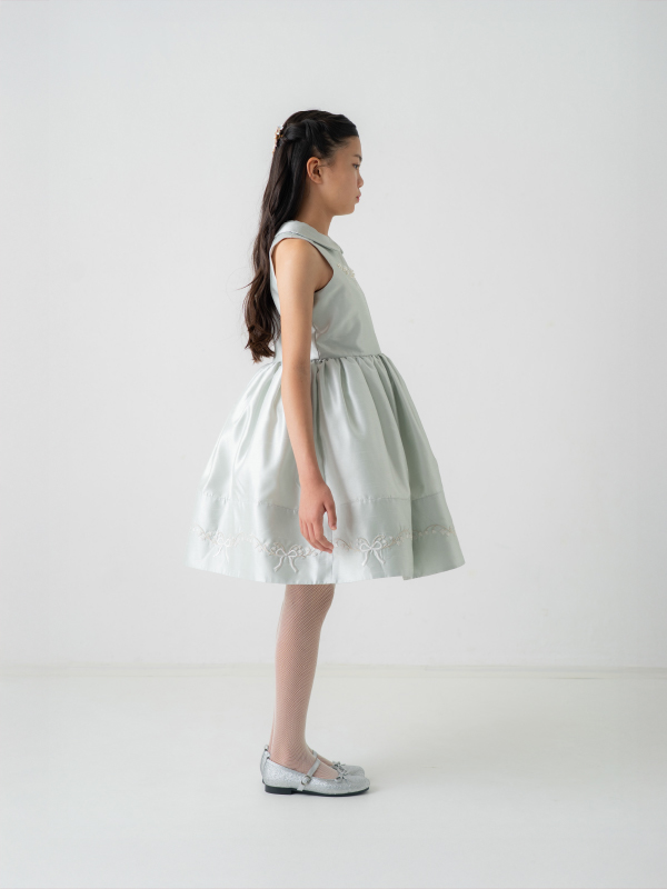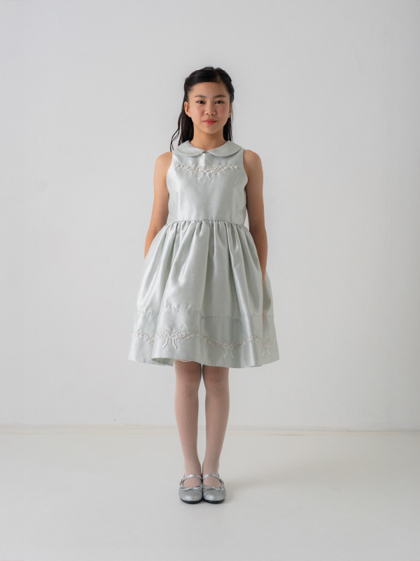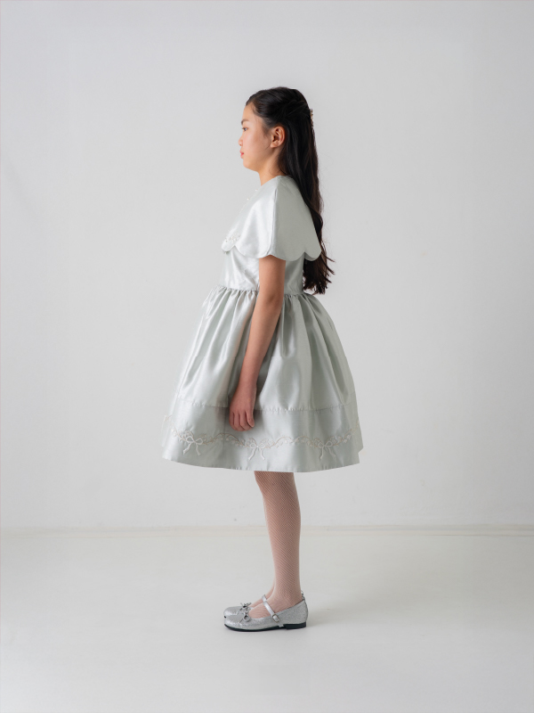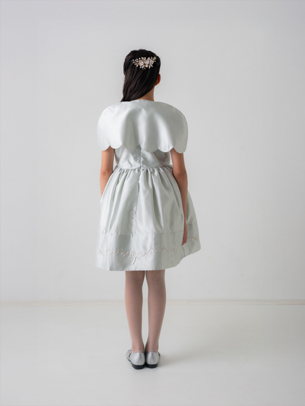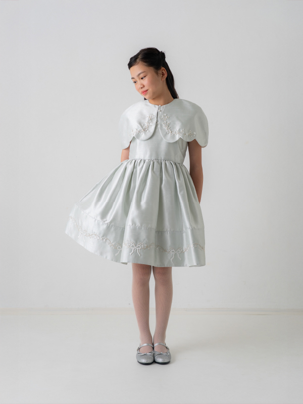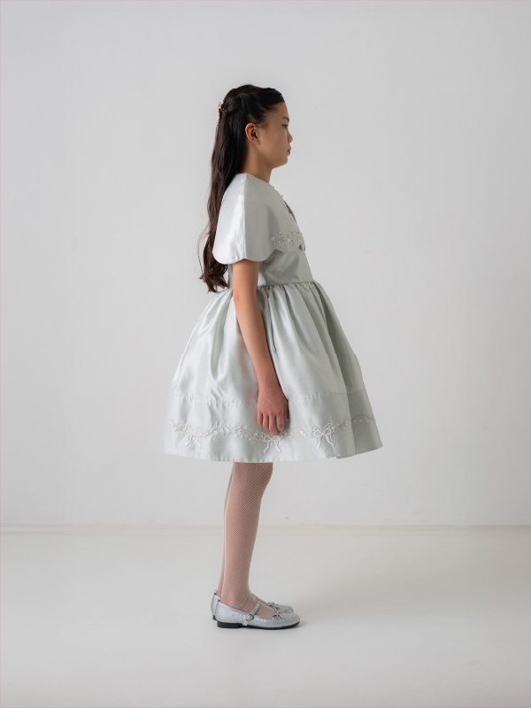 爽やかなミントブルーのミニ丈ドレス。丸襟がとても可愛らしく、胸元と裾の詩集がとても上品なデザインです。おそろいのケープにもドレスと同じ刺繡がほどこされており、オールシーズンご利用できるドレスです。 (おサイズ違い115cmあります。)