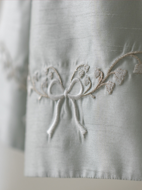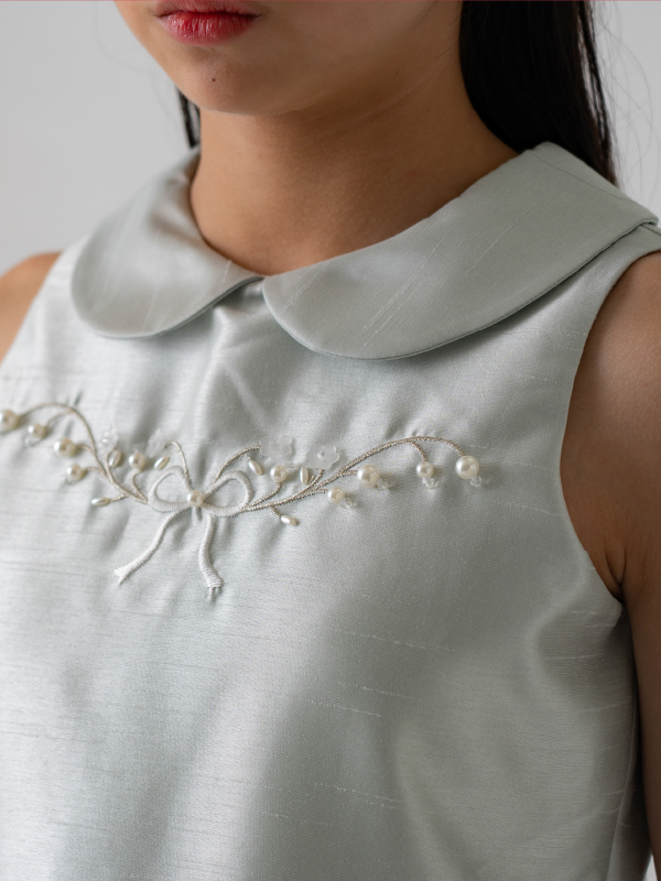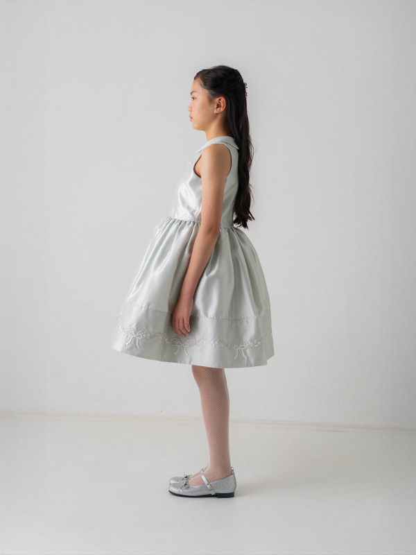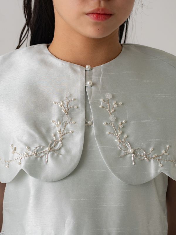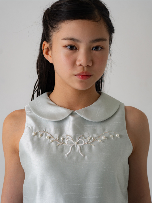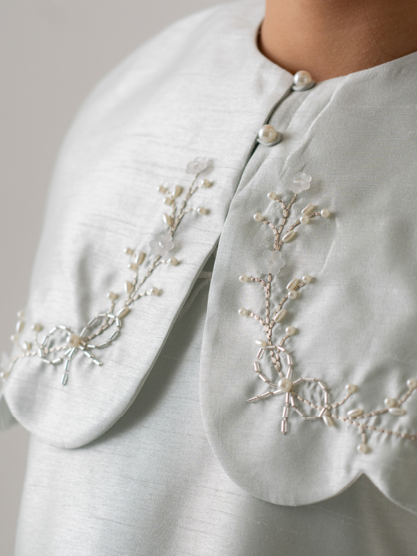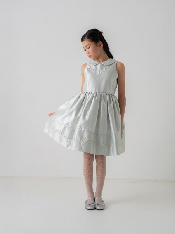 爽やかなミントブルーのミニ丈ドレス。丸襟がとても可愛らしく、胸元と裾の詩集がとても上品なデザインです。おそろいのケープにもドレスと同じ刺繡がほどこされており、オールシーズンご利用できるドレスです。 (おサイズ違い115cmあります。)