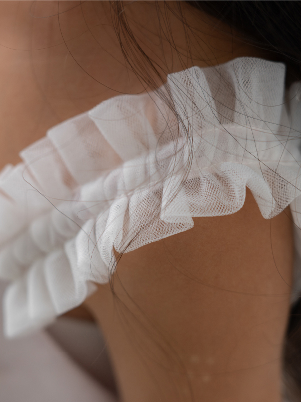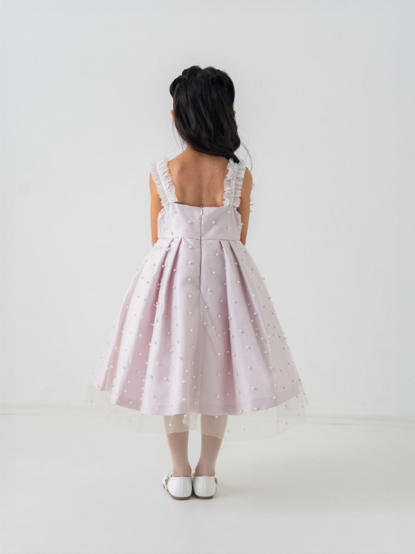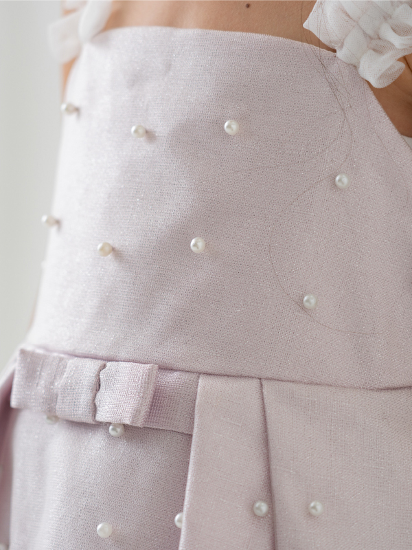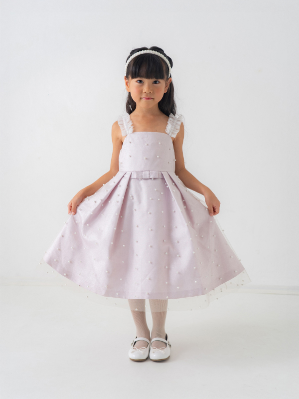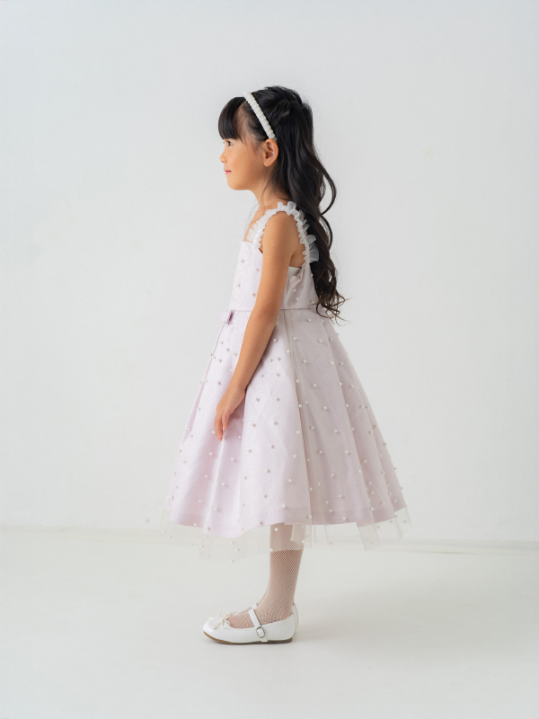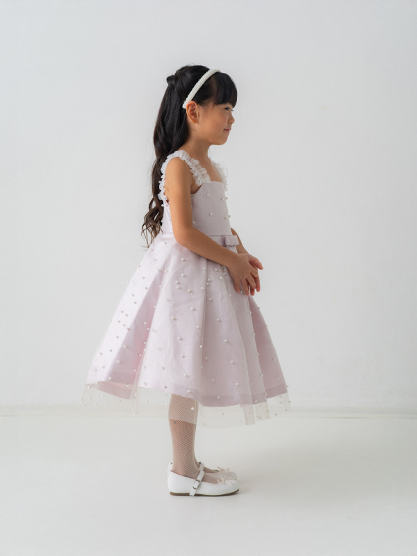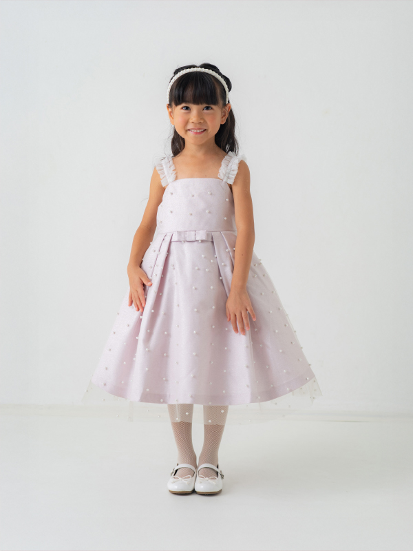 全体にあしらわれたパールと肩紐のホワイトレースがとてもキュート。上質なドレスでフォーマルアップしてみませか。