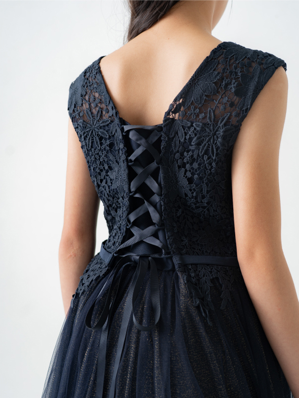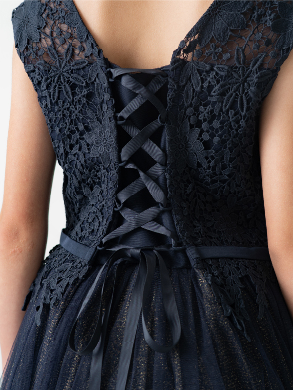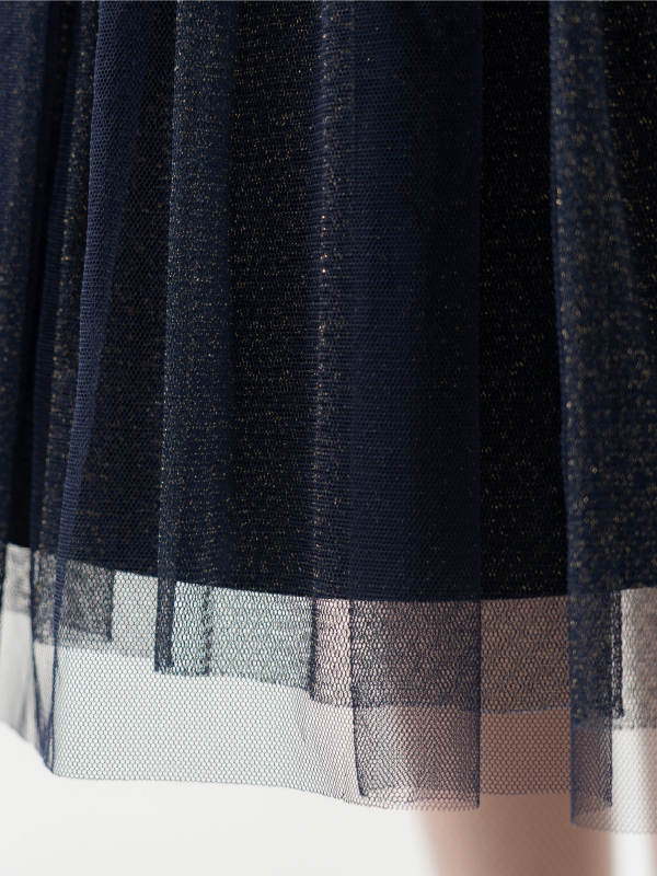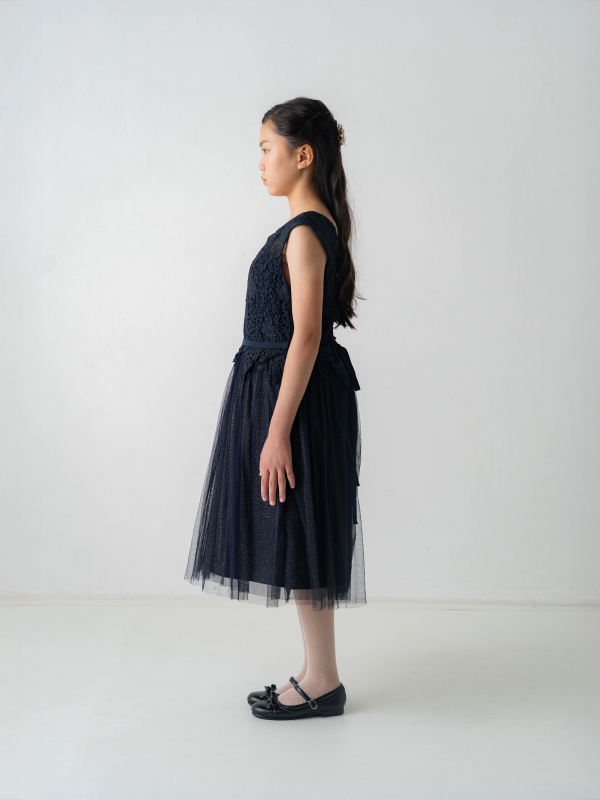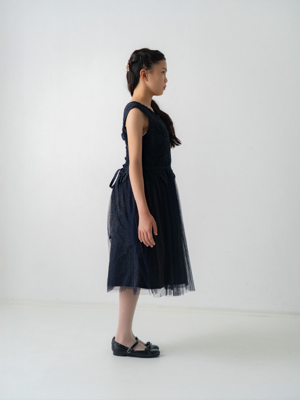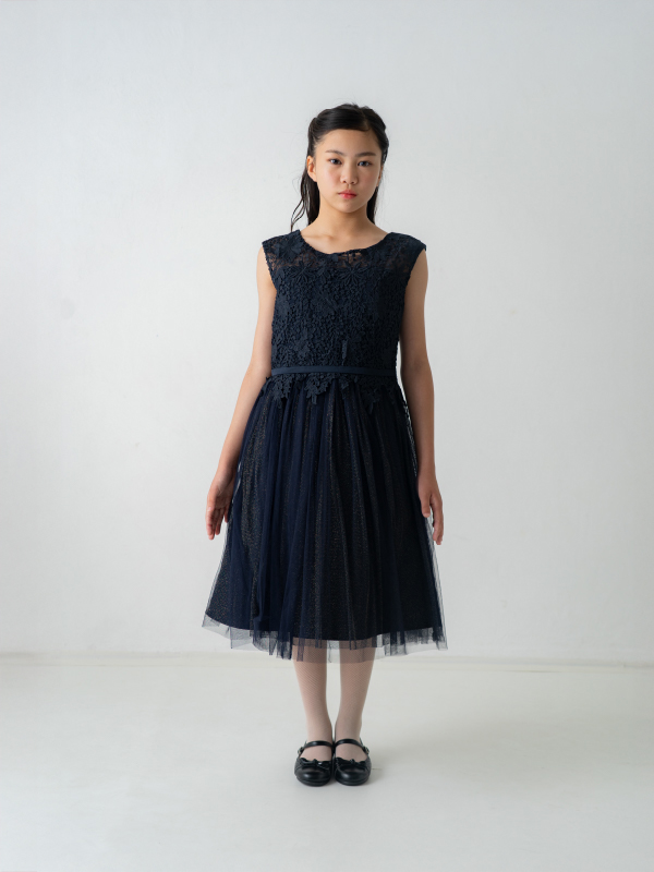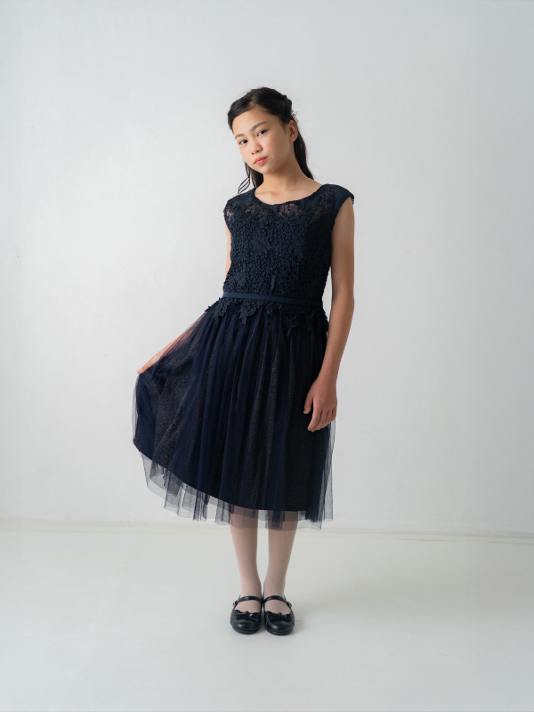卒業式・お食事会・ピアノ発表会・結婚式参列など幅広くお召し頂けます。 スカートチュール下の生地がゴールドラメを使用してるため、程よく華やかな印象となります。
