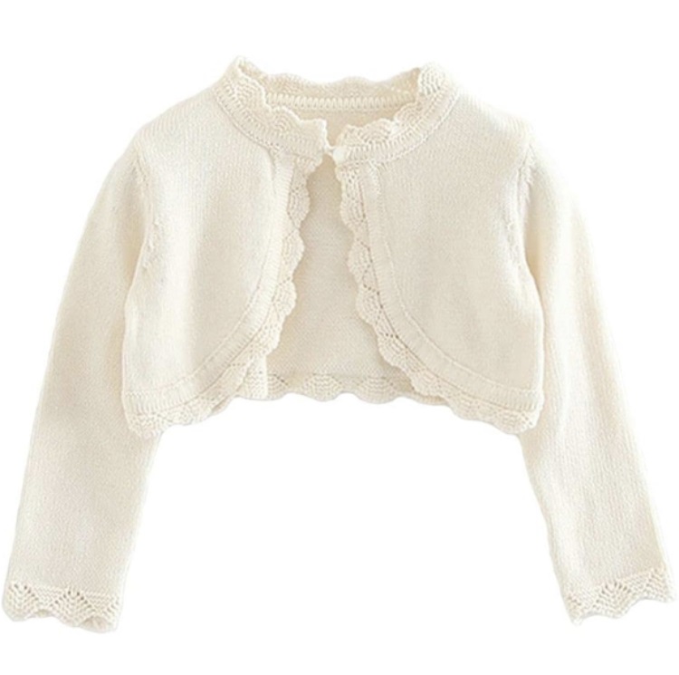 袖口から胸元、首周りのレースが可愛らしい長袖ボレロです。 秋口からまだ肌寒い春先にかけ防寒対策にもなり、優しい色目のホワイトがドレスとの相性のよいボレロです。