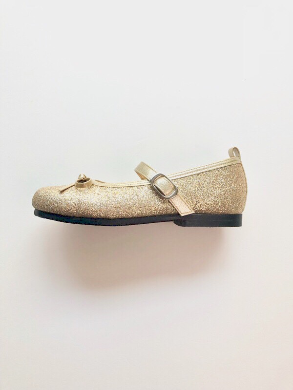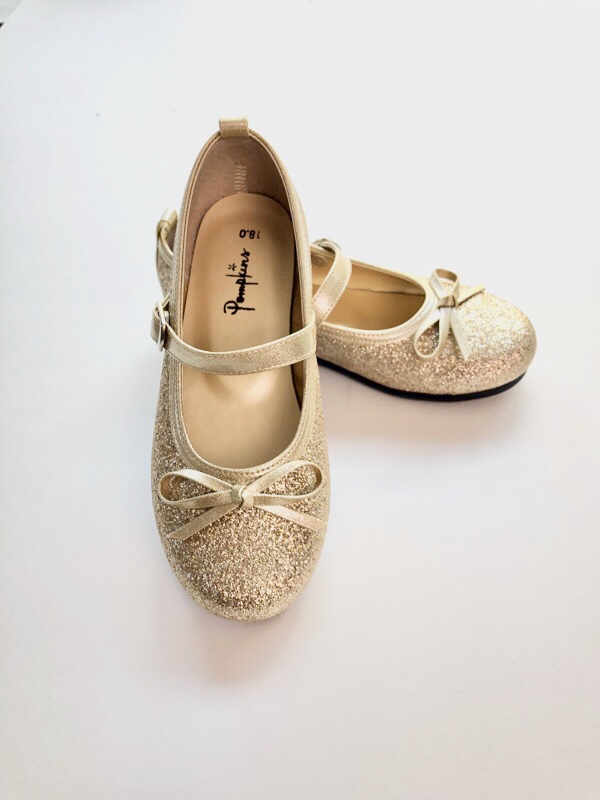きらきらグリッターが華やかなストラップ付きフラットシューズです。ピアノ発表会・結婚式参列の際に人気のシューズです。